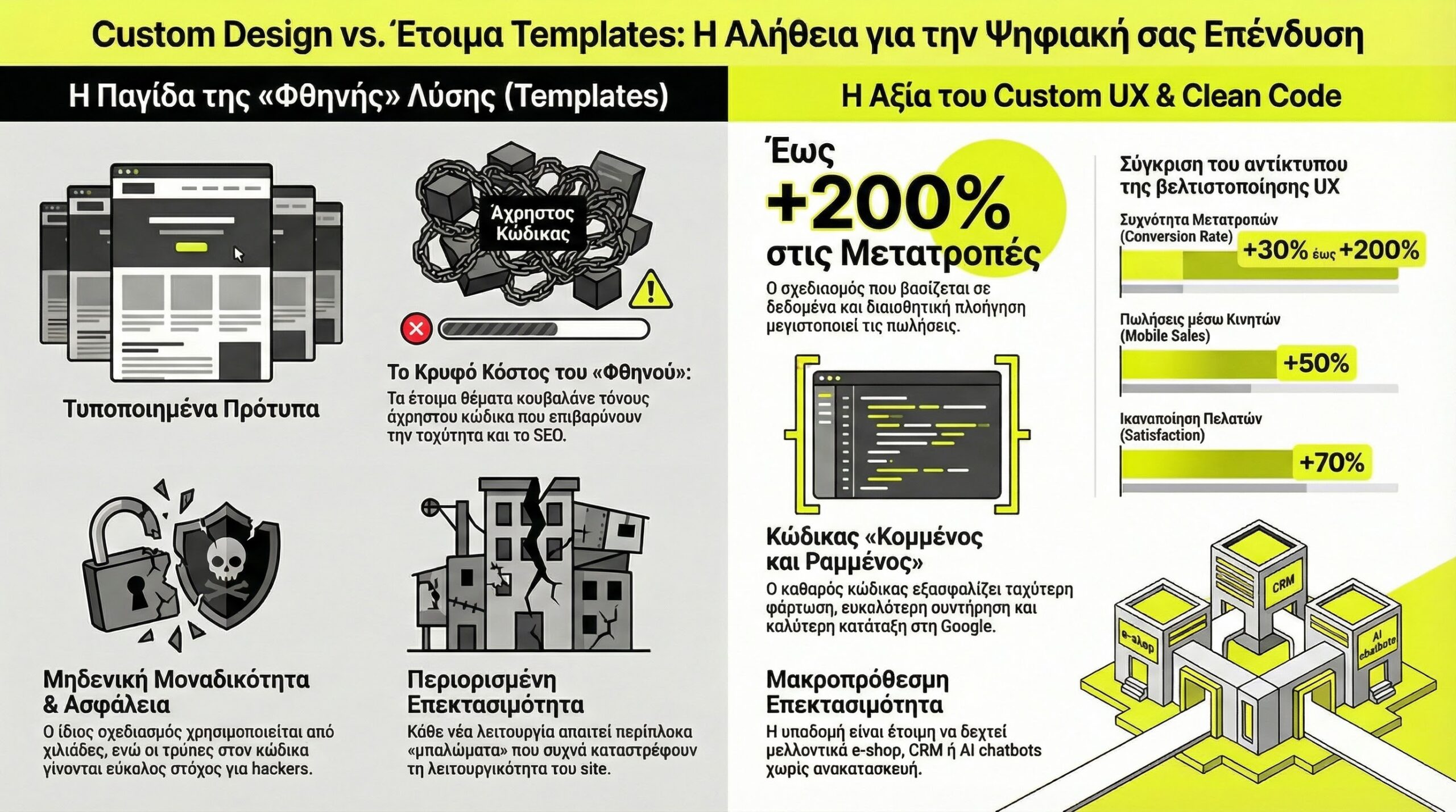 Η επιλογή μεταξύ Custom και Template δεν είναι αισθητική, είναι καθαρά επενδυτική. Το έτοιμο Template προσφέρει χαμηλό αρχικό κόστος, αλλά λειτουργεί ως "ενοικιαζόμενος" χώρος με περιορισμούς στην ταχύτητα και την ασφάλεια. Αντίθετα, η Custom κατασκευή αποτελεί περιουσιακό στοιχείο της επιχείρησης. Ο κώδικας γράφεται αποκλειστικά για εσάς, εξασφαλίζοντας μέγιστη ταχύτητα φόρτωσης και απόλυτη ελευθερία μελλοντικών επεκτάσεων, χωρίς να χρειάζεται να πετάξετε την επένδυσή σας και να ξαναχτίσετε από την αρχή όταν αυξηθούν οι απαιτήσεις.